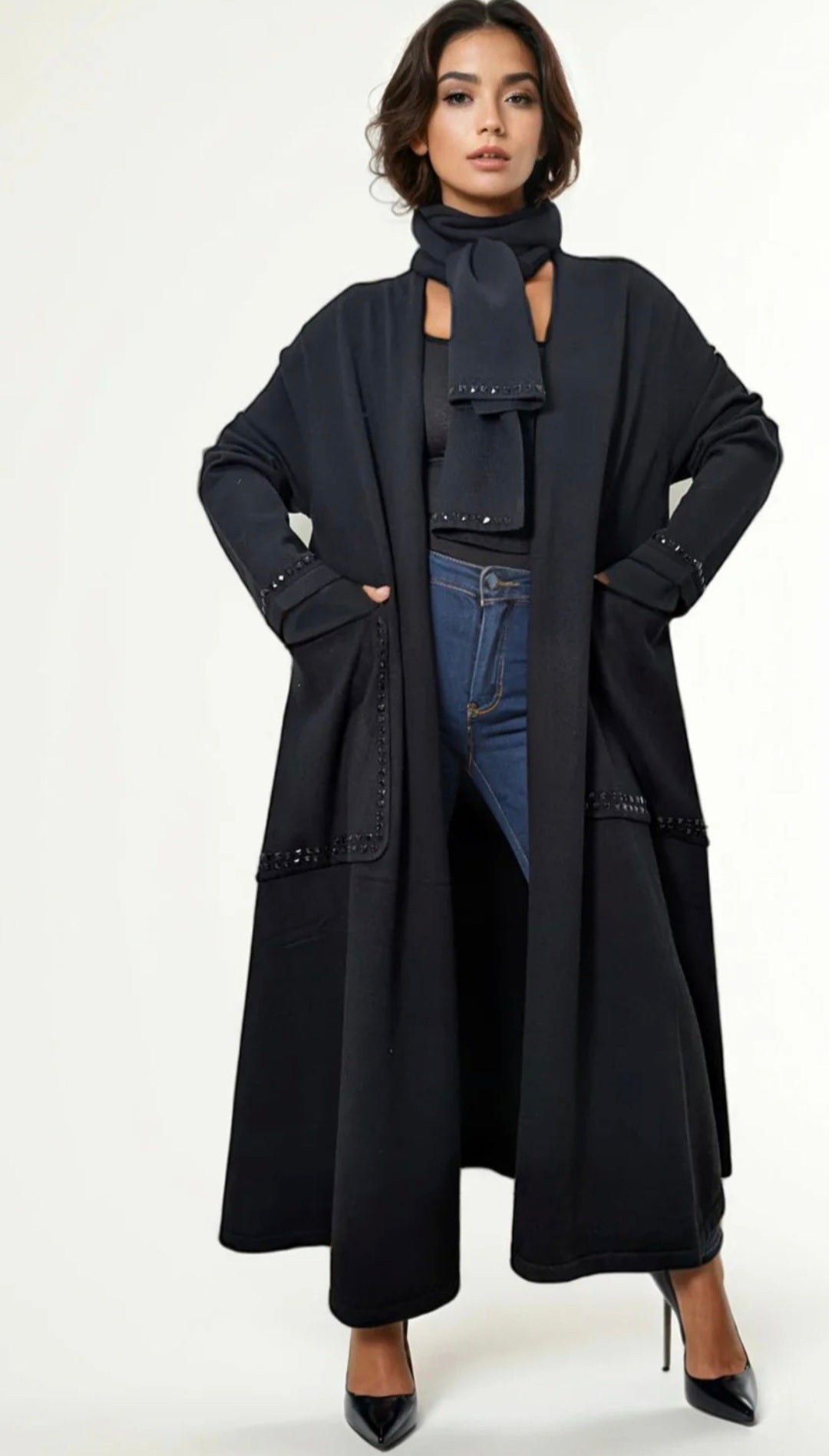 This luxurious black sweater combines comfort with understated glamour, featuring shimmering embellishments on the front pockets and coordinating scarf collar. The relaxed silhouette offers a generous fit that accommodates layering, making it ideal for effortless styling. Available in sizes Small through X-Large, each cut to provide ample room for movement and versatility across multiple sizes.