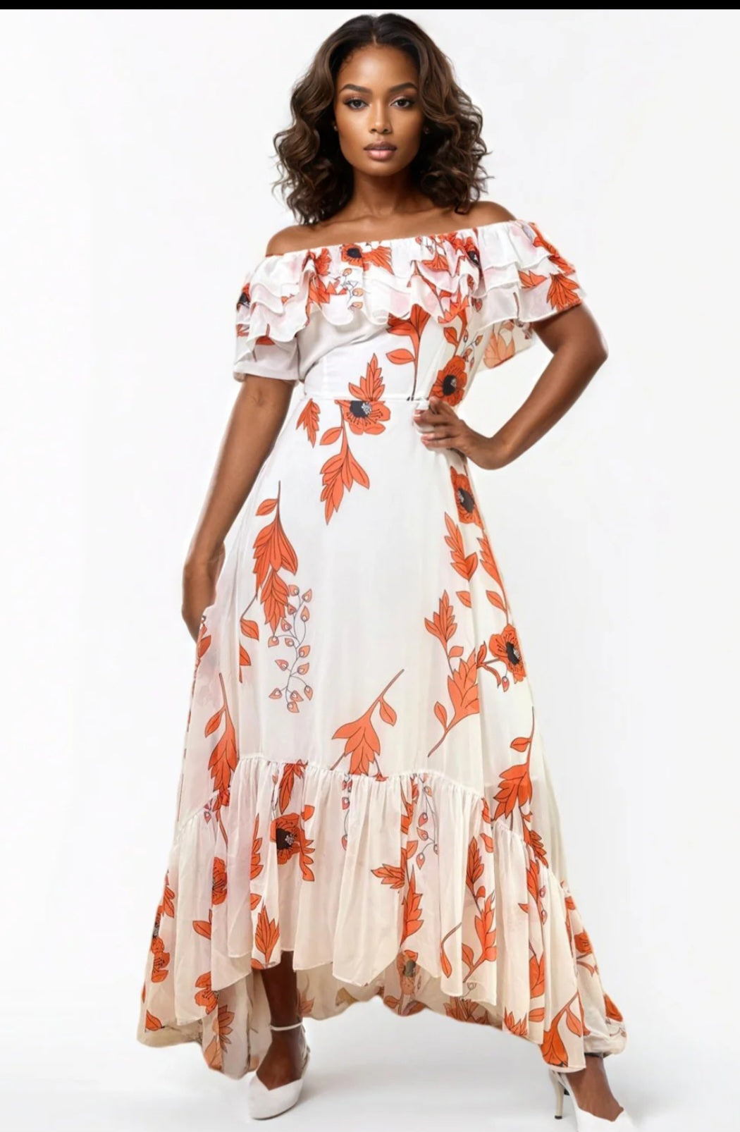 Step out in this exclusive hi-lo maxi dress with ruffled cold shoulders, an elastic off the shoulder neckline. and a bold orange and white floral print. Lightweight and lined with a side zipper for easy wear.